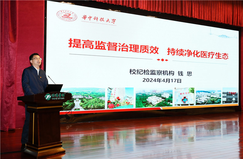 华中科技大学纪委副书记钱思同志出席会议并讲话。他详细介绍了目前全面从严治党的形势,强调2023年7月以来,10部委部署开展为期1年的全国医药领域腐败问题集中整治工作。他分析了医药领域腐败问题的五个表现并深入剖析原因,同时通过医药领域腐败典型案例警示广大领导干部、医务人员要进一步以案为鉴、以案为戒,守住拒腐防变防线。他表示学校党委、纪委将进一步落实“两个责任”,加强对附属医院的全面领导和有力监督;要求医院党委切实履行主体责任,进一步完善监督体系和治理体系,医院纪委持续加大执纪审查力度,保持惩治腐败高压态势。他强调,要不断提高监督治理质效,持续净化医疗生态,加强清廉医院建设,为推进健康中国建设贡献更多力量!