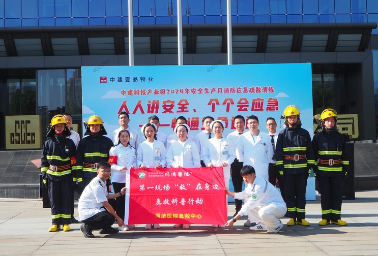 今年六月,正值全国第23个“安全生产月”之际,为深化消防和急救安全意识的普及,并提升公众在突发事件中的应急响应与处理能力,同济医院光谷急诊科、院前急救中心及重症医学科共同组建了多学科联动式“第一现场,‘救’在身边”志愿者团队。6月13日,该团队受邀参加了中建科技产业园举办的以“人人讲安全、个个会应急—畅通生命通道”为主题的科普培训活动。