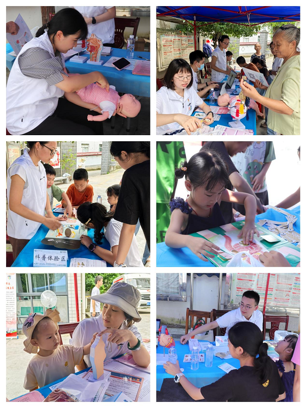 针对当地医疗资源薄弱的现状,服务团精心组织了内科、外科、妇科、儿科、中医科、老年科、康复科、眼科、皮肤科、重症医学科等科室的优秀硕博生,在解放岩乡卫生院开展了面向周边群众的医疗咨询服务。同学们详细询问了乡亲们的病史和诊疗情况,耐心给出导医就诊建议,累计服务超过200人次。同时,针对农村老人高血压、糖尿病等基础病高发的情况,内科专业的同学为乡亲们测量血压、血糖;眼科专业的同学为少年儿童进行视力检查;中医科的同学则提供了冬病夏治的三伏贴活动,并现场制作香囊分发给参与活动的老人和儿童。此外,服务团还创意性地设置了科普体验区,为留守儿童进行健康启蒙教育。此次活动得到了乡亲们的热烈响应和高度评价。