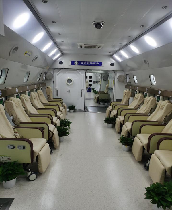 走进同济医院军山创新基地高压氧治疗中心,让人眼前一亮:直列大气的高压氧舱群,通过观察窗可以清楚观察到舱内场景,舱外操控台设有供排气系统,供排氧系统,对讲系统、视频监控系统,计算机智能操控系统,测氧仪等;可以通过以上系统及设备精准调节舱内压力及氧浓度,实时监测患者状态;舱内宽敞明亮,设有消防水喷淋系统、舱内空调系统、氧气雾化装置、急救供氧系统及负压吸引装置。