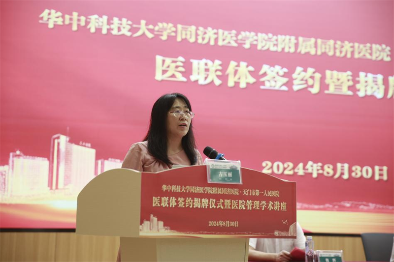 天门市副市长古玉丽对同济医院长期以来对天门卫生健康事业特别是对天门市第一人民医院的大力支持表示感谢。天门市第一人民医院综合实力位列全国百强县级医院第9位,连续13年中部地区第一。天门市委市政府将进一步深化以公益性为导向的公立医院改革,创造良好的环境和条件,全力支持医联体建设和发展。希望天门市第一人民医院把握机遇,加强与同济医院的沟通对接,深化人才、技术和管理合作,积极学习先进经验、精湛医术和优良作风,努力提高诊疗能力、医护质量、服务水平和管理理念,持续提升天门卫生健康保障水平和群众就医获得感。