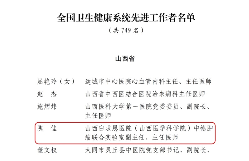3月31日,人力资源社会保障部、国家卫生健康委、国家中医药局、国家疾控局联合发布《关于表彰全国卫生健康系统先进集体、先进工作者及"白求恩奖章"获得者的决定》。华中科技大学附属同济医院血液内科副主任隗佳教授以其援建国家区域中心山西白求恩医院的杰出贡献被授予“全国卫生健康系统先进工作者”称号。