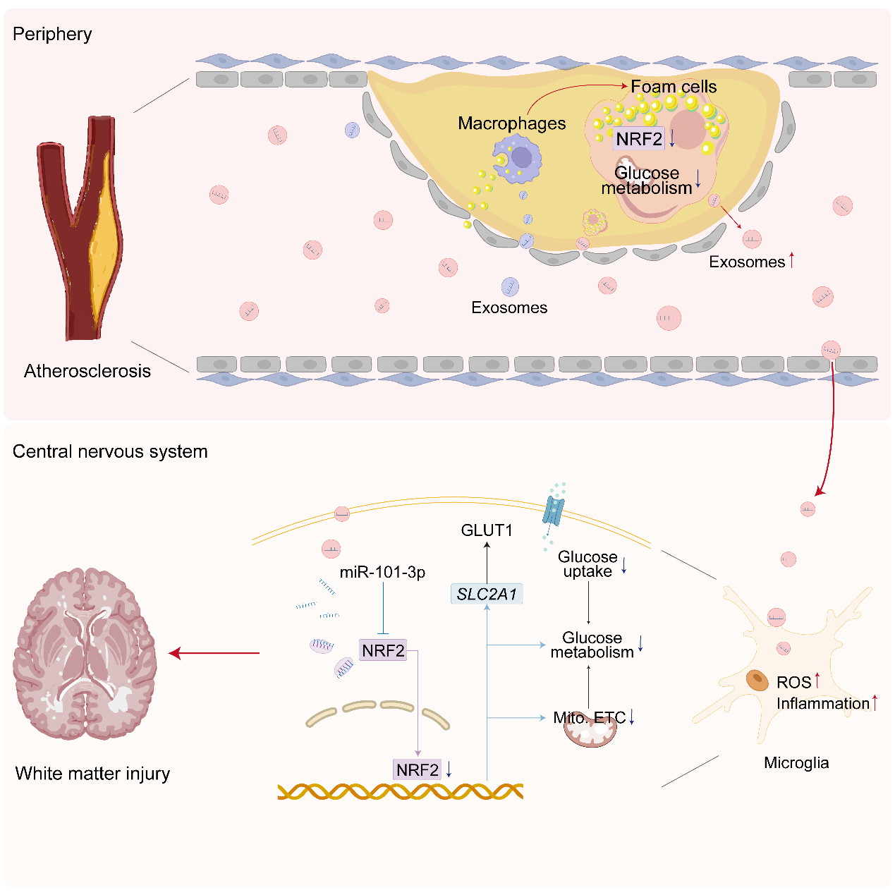 在研究过程中,团队首先通过公共数据库分析发现动脉粥样硬化可独立于脑血流动力学因素加剧脑白质损伤。随后,基于动脉粥样硬化患者队列的血样标本研究,他们发现了动脉粥样硬化循环外泌体的异质性。利用动脉粥样硬化小鼠模型和缺血性白质损伤小鼠模型,进一步证实了动脉粥样硬化循环外泌体可加剧缺血性白质损伤和血管性认知功能障碍。通过动脉粥样硬化斑块组织标本,结合单细胞测序、外泌体 miRNA 组学测序等多组学联合分析,研究人员发现动脉粥样硬化斑块中巨噬细胞衍生的泡沫细胞持续释放的外泌体可将miR-101-3p 转移至小胶质细胞,抑制小胶质细胞 Nrf2 信号通路,加剧氧化应激损伤、线粒体功能障碍和葡萄糖代谢缺陷。更为关键的是,通过遗传性或药理性地阻断miR-101-3p-Nrf2 轴,可以改善动脉粥样硬化外泌体加剧的白质损伤。