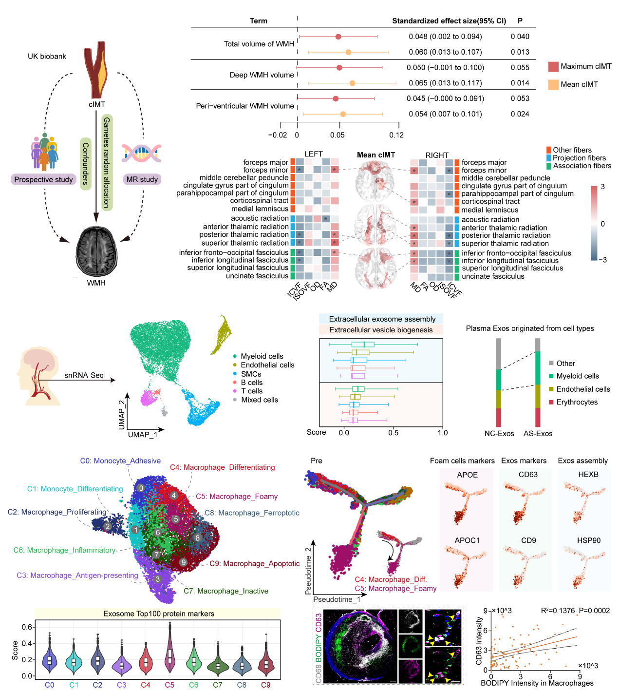 秦川教授研究团队综合运用公共数据库、动脉粥样硬化患者队列、单细胞测序以及多组学联合分析等多种技术手段,发现了动脉粥样硬化斑块中巨噬细胞衍生的泡沫细胞来源的外泌体在其中的关键作用。这些外泌体能够将氧化还原失衡和代谢缺陷传递至中枢神经系统中的小胶质细胞,从而加剧缺血性白质损伤和认知功能障碍。这一研究揭示了一种独立于脑血流动力学改变的动脉粥样硬化加剧脑白质损伤的全新病理生理机制。