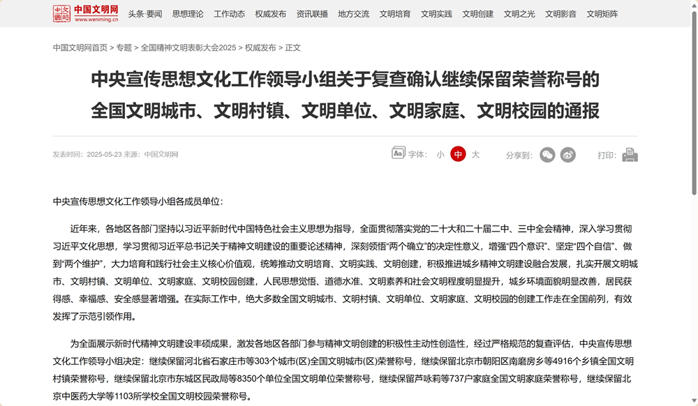5月23日,全国精神文明建设表彰大会在北京召开,中央宣传思想文化工作领导小组认定命名第七届全国文明城市、文明村镇、文明单位和第三届全国文明家庭、文明校园;复查确认继续保留荣誉称号的全国文明城市、文明村镇、文明单位、文明家庭和文明校园。