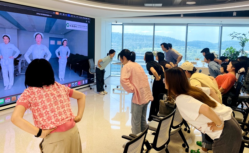针对科技企业员工长期伏案、高压力的工作特点,光谷院区骨科团队专门设计了一套适用于办公场景的“颈腰椎活力健康操”。活动中,资深护士苏印担任健康指导员,清晰讲解了每个动作的设计原理和健康益处,并带领全体员工进行了精准的现场示范教学。