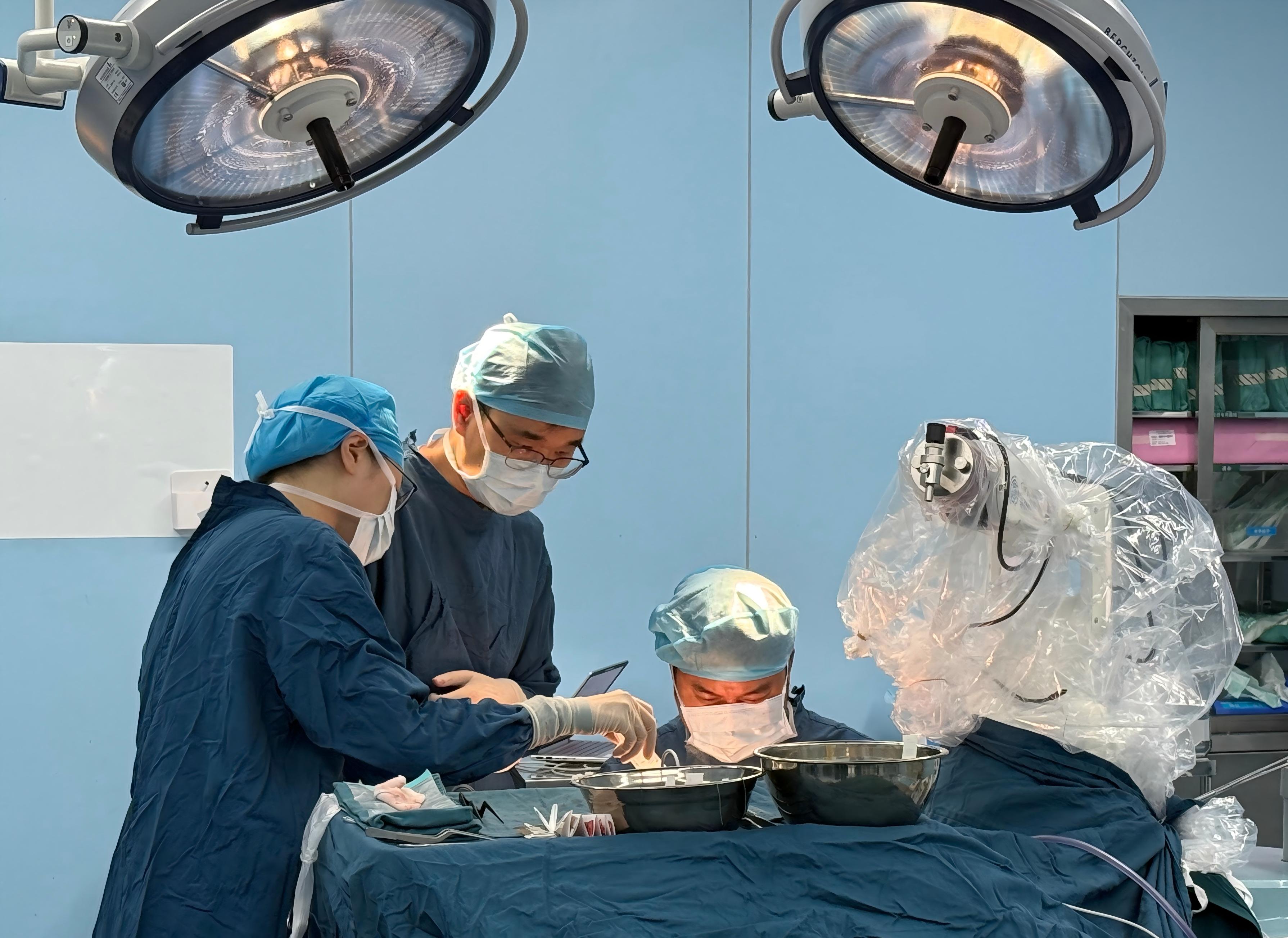 6月28日,在该项目负责人唐洲平教授指导下,同济医院神经外科舒凯、胡峰医生团队为高女士实施了华中地区首例植入式脑机接口手术,在神经外科机器人导航下,医生将两根电极精准植入到患者左侧脑部硬膜外手部运动和感觉区,同时在皮下埋藏1元硬币大小的记录设备,后续患者可通过皮肤无线进行供电和数据传输,整个手术不侵入脑组织,2个多小时手术顺利完成。