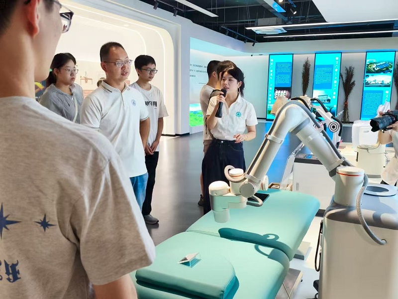 12日清晨,实践队首站抵达湖北省蕲艾集团,开启蕲艾文化探秘之旅。在文化展示中心,借助全息投影技术重现的明代蕲州药市盛景,让队员们直观感受到“蕲艾”作为道地药材的厚重历史。在非遗技艺体验区,队员们亲身体验古法艾条制作,从筛选三年陈艾,到手工研磨、桑皮纸卷制,每道工序均严格遵循《本草纲目》记载古法。看着亲手制成的艾条,队员们脸上洋溢着收获的喜悦。更令人印象深刻的是科技赋能的现代实践:智能艾灸机器人精准施灸,温控系统保障疗效;艾草精油全自动提取生产线高效运转。队员们亲眼见证了一株艾草如何通过“种、产、研、销”全产业链,成长为带动蕲春农户增收致富的支柱产业。