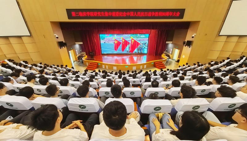 2025年9月3日,中国人民抗日战争暨世界反法西斯战争胜利80周年纪念日之际,华中科技大学同济医学院第二临床学院组织师生集体观看纪念大会,并同步举办2025级研究生入学教育第二场活动。全体新生庄严肃穆,共同见证这一庄严而神圣的时刻,青年学子们在回望民族征程中锚定方向,在感知时代脉搏中更加明晰新时代的责任与担当。