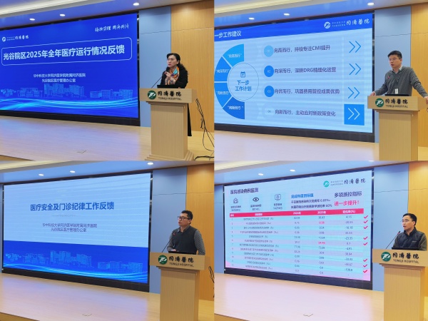 会议伊始,光谷院区医疗管理办公室主任陈瑜汇报了光谷院区 2025 年度医疗工作。陈瑜以数据为支撑,系统分析了光谷院区门诊、住院、儿童医院以及护理工作的运行情况,总结成效,指出短板,并提出针对性改进路径。