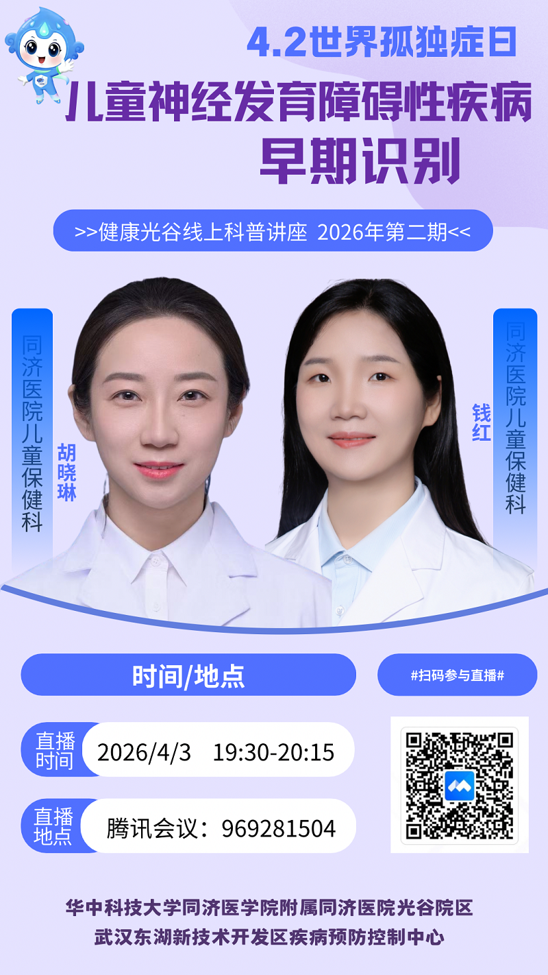 为纪念第19个世界孤独症日,提升公众对儿童神经发育障碍的认知。4月3日,华中科技大学同济医学院附属同济医院光谷院区联合武汉东湖新技术开发区疾病预防控制中心举办“健康光谷”线上科普讲座2026年第二期,主题为《儿童神经发育障碍性疾病早期识别》,共有326个家庭线上参会。
