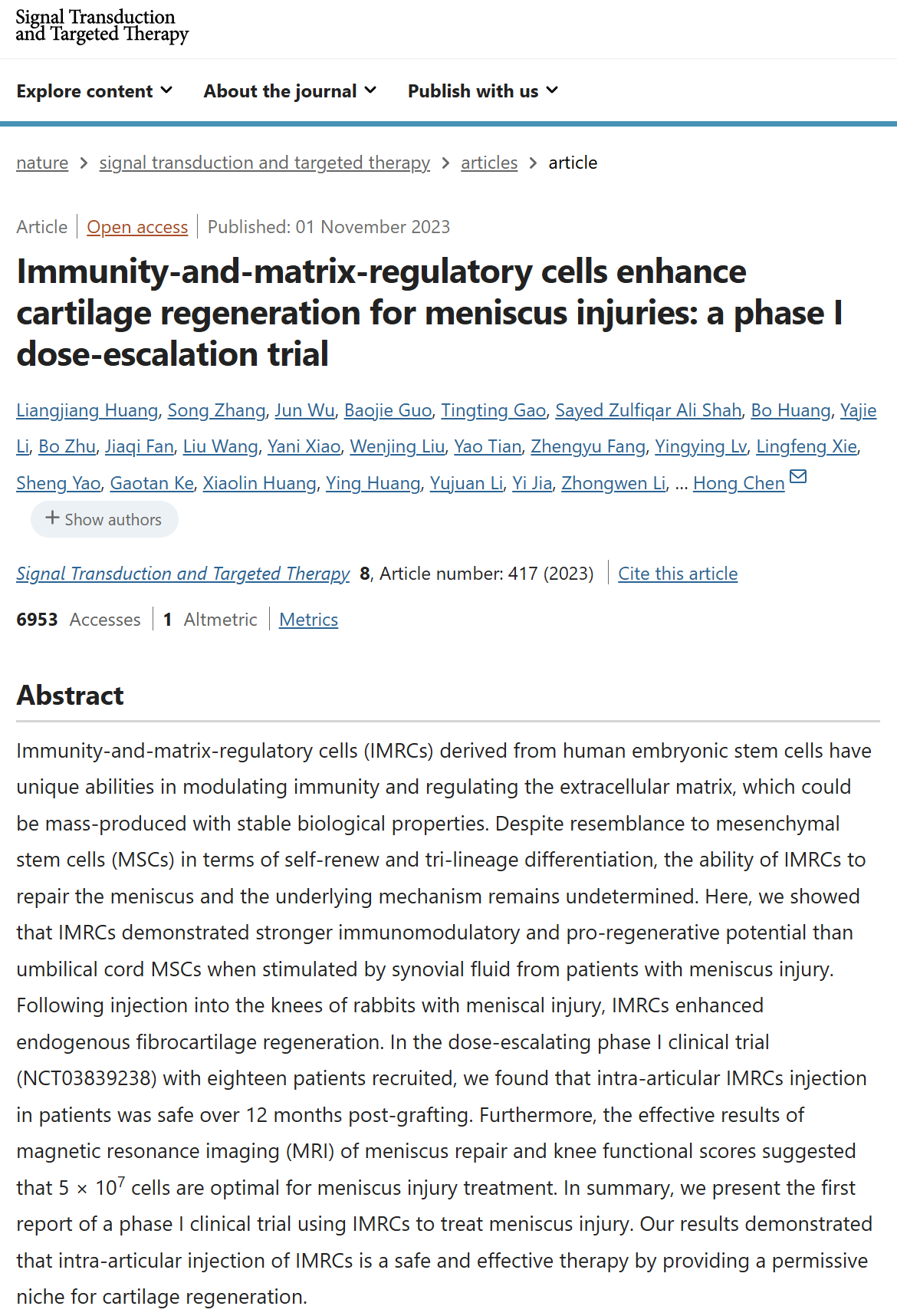 代表性文章1:华中科技大学同济医学院附属同济医院康复医学科的陈红教授带领黄梁江、张松等团队成员,联合中国科学院动物研究所团队,在国际著名 Nature 子刊 《Signal Transduction and Targeted Therapy》(简称STTT,影响因子40.8)上刊发研究型论文,在全世界首次证实了人胚干细胞来源的免疫及基质调节细胞治疗半月板损伤的临床安全性及初步有效性,并进一步揭示了该干细胞修复半月板软骨的重要分子机制,为临床半月板损伤的治疗提供了一种全新、有效的治疗手段。