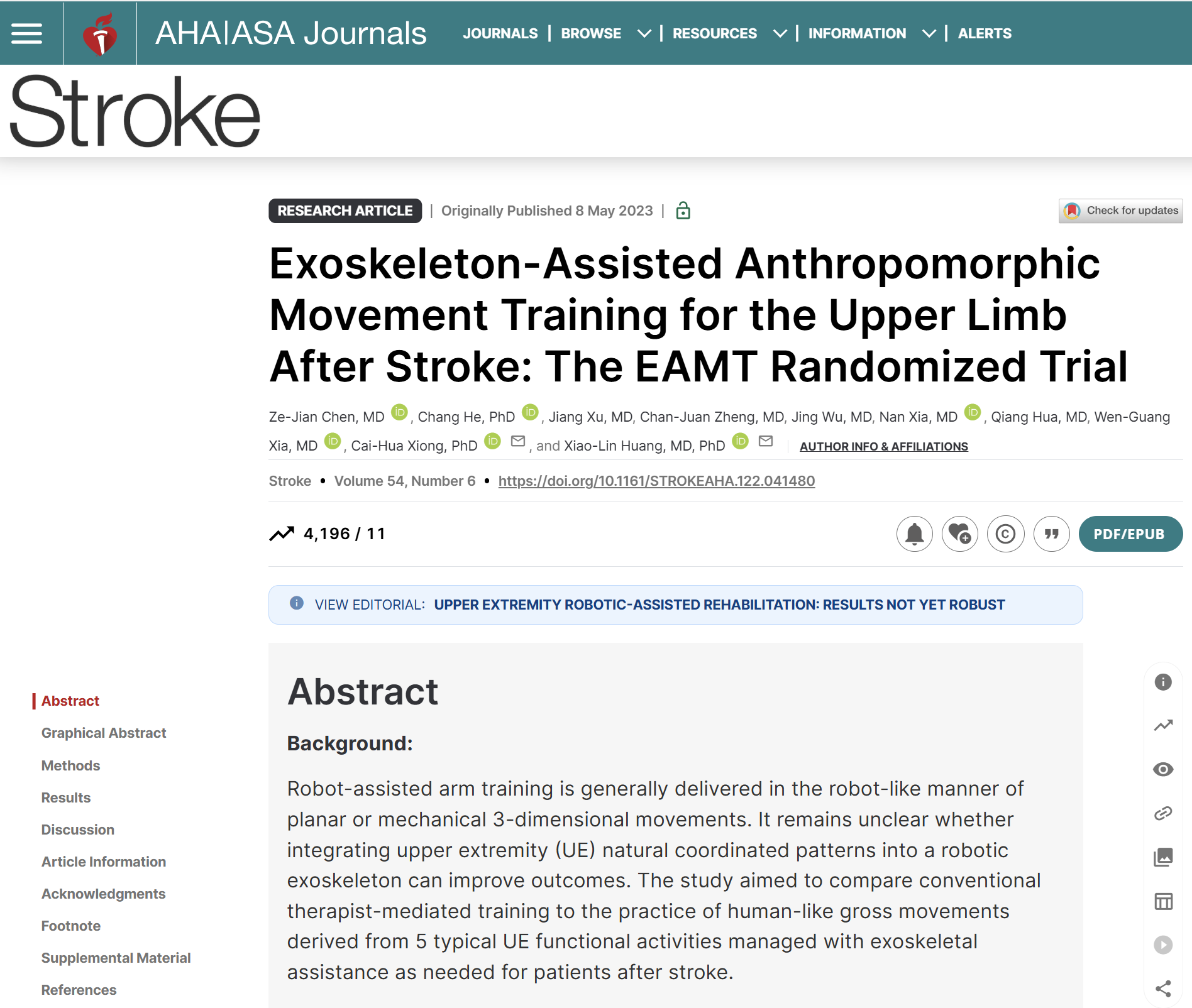 代表性文章2:我科主管治疗师陈泽健为论文第一作者,黄晓琳教授为通讯作者。《Stroke》杂志是美国卒中协会(American StrokeAssociation)的官方杂志,是中科院一区TOP期刊。