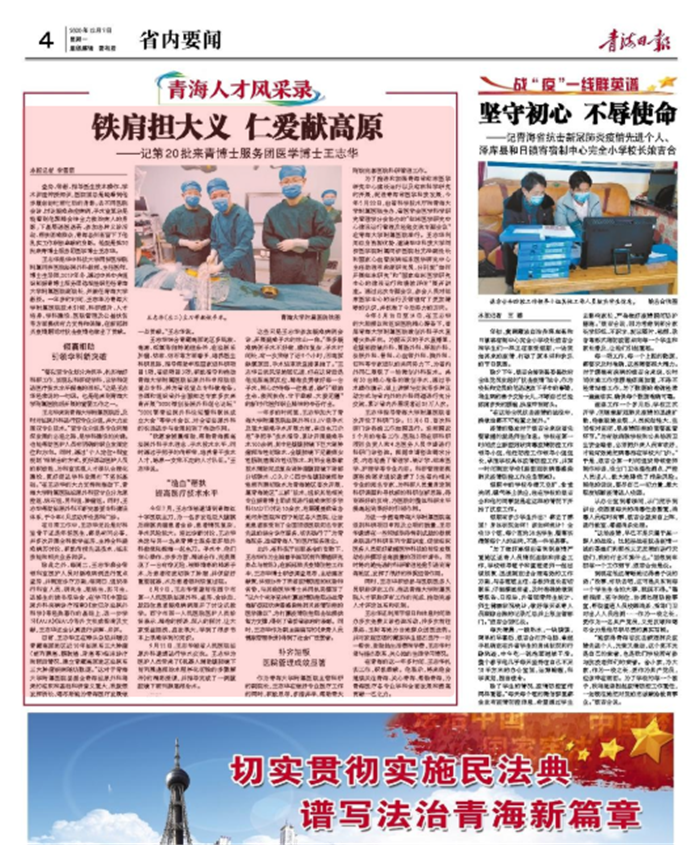 近日,为了树立援青博士团成员先进典型和弘扬共产党员甘于奉献、大爱无疆的精神,青海省《青海日报》对华中科技大学同济医学院附属同济医院王志华同志的个人先进事迹进行了宣传报道,同时被人民网、学习强国、今日头条、搜狐等媒体转载点赞。青海大学附属医院也特意向同济医院发来感谢信,感谢同济医院不断输送优秀人才支援青海大学附属医院事业发展和国家西部建设。