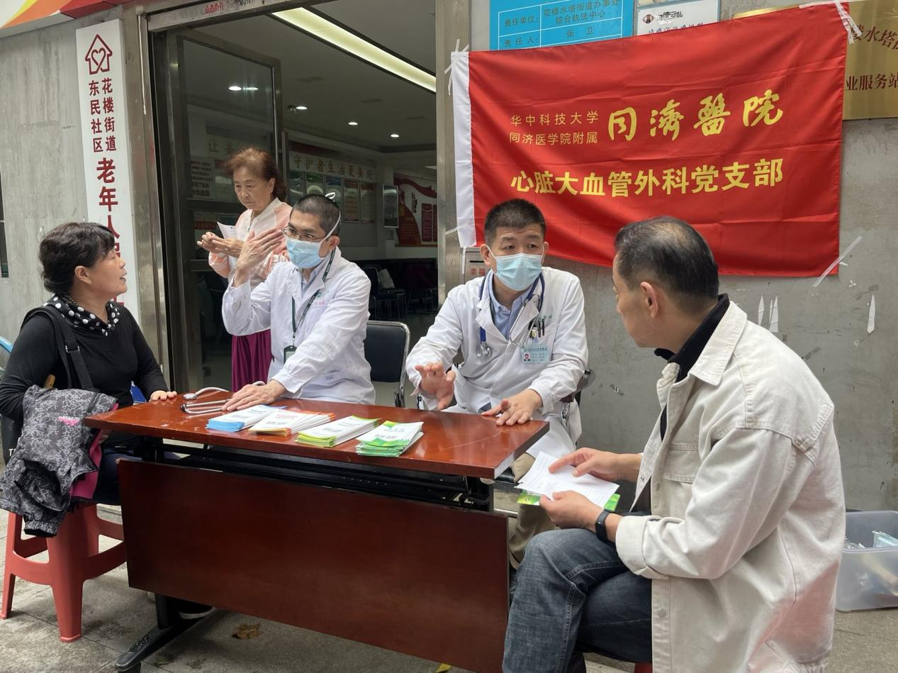 为满足人民群众多层次、多样化的医疗需求,同济医院心脏大血管外科党支部于2023年5月24日,在陈涛书记带领下,由数位党员同志组成志愿服务小分队,在江汉区东民社区开展义诊活动,让群众在家门口就能看病就医,以实际行动践行志愿服务精神,将保障群众健康工作真正落到实处。