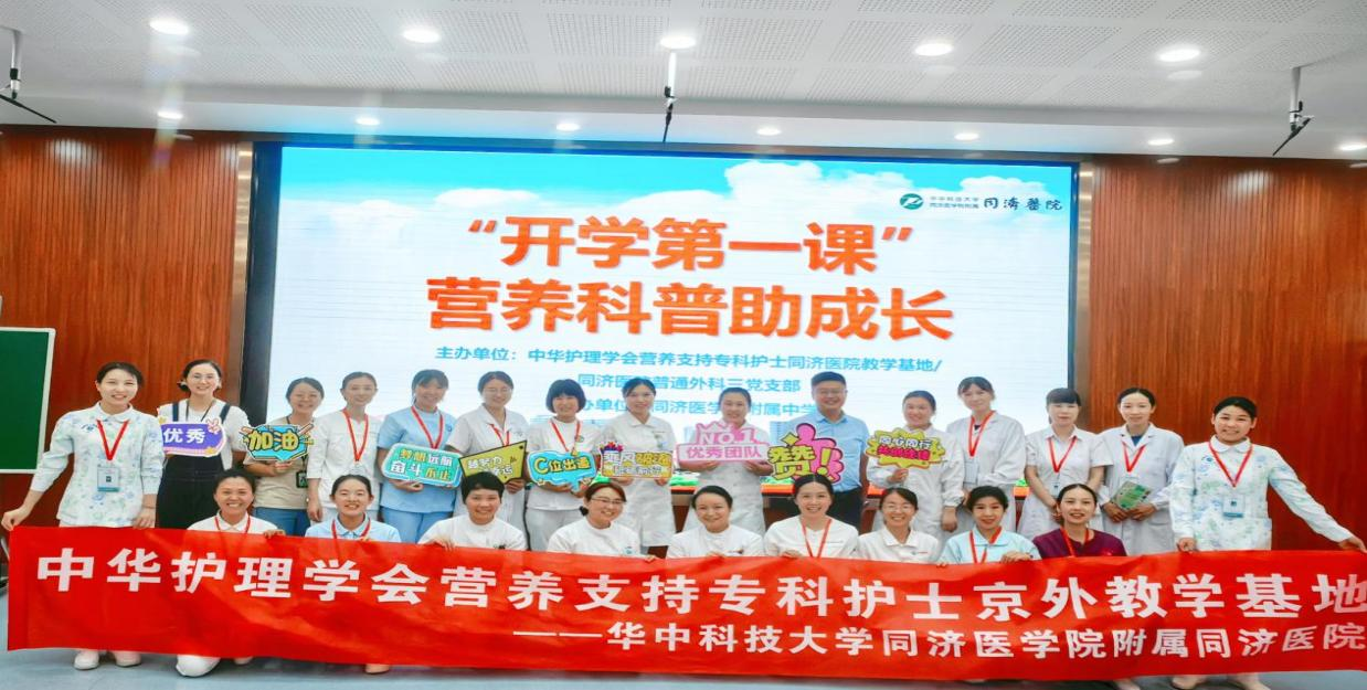 为了提高青少年科学膳食意识,养成健康合理的饮食习惯,2023年9月5日下午,同济医院营养支持专科护士教学基地联合同济医院普通外科三党支部走进华中科技大学同济医学院附属中学,为全体师生带来“开学第一课——营养科普助成长”活动。本次活动由同济医院营养支持专科基地负责人、普通外科三党支部组织委员、胃肠外科朱丽护士长主持,同济医学院附属中学金辉吉副校长、殷志辉主任、马豪副主任、同济医院胃肠外科徐向上医生及学校100多名师生参加本次活动。