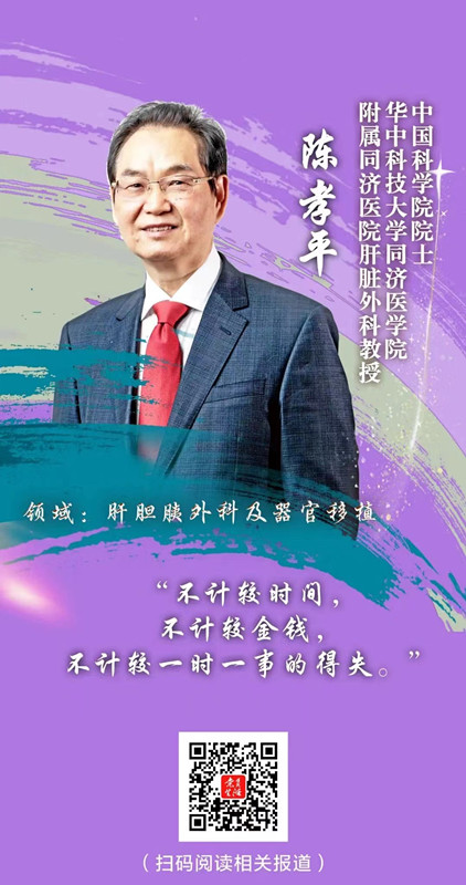颁奖词提到,陈孝平从事肝胆胰外科临床工作和基础研究40余年,在肝癌外科治疗和肝移植方面作出了系统的创新性成果,被国内外同行称为“肝胆胰外科技术改革和创新的领导者”。他厚德至善,大医精诚,作为手术刀尖上的舞者,在肝脏手术禁区谱写生命的奇迹!