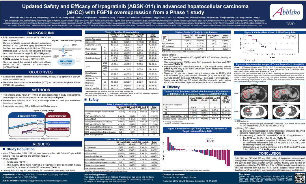 在刚刚落幕的2024年欧洲肿瘤内科学会(ESMO)年会上,由中国科学院院士、同济医院外科学系主任陈孝平牵头开展的全国多中心临床研究“ABSK-011治疗FGF19过表达的晚期肝细胞癌(aHCC)的安全性和有效性”荣获“最佳壁报奖”。这也是本次大会肝细胞癌壁报环节中的唯一获奖者。