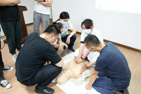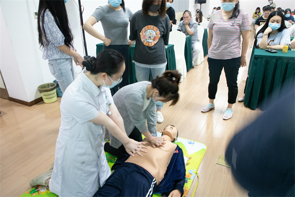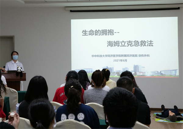 肖馨爽主管护师为大家讲解了海姆立克的发生发展及在不同情境下如何正确实施海姆立克手法。谭杰、黄文洁护师用演示讲解相结合的方式为大家展示了高质量的心肺复苏实施流程及要点。