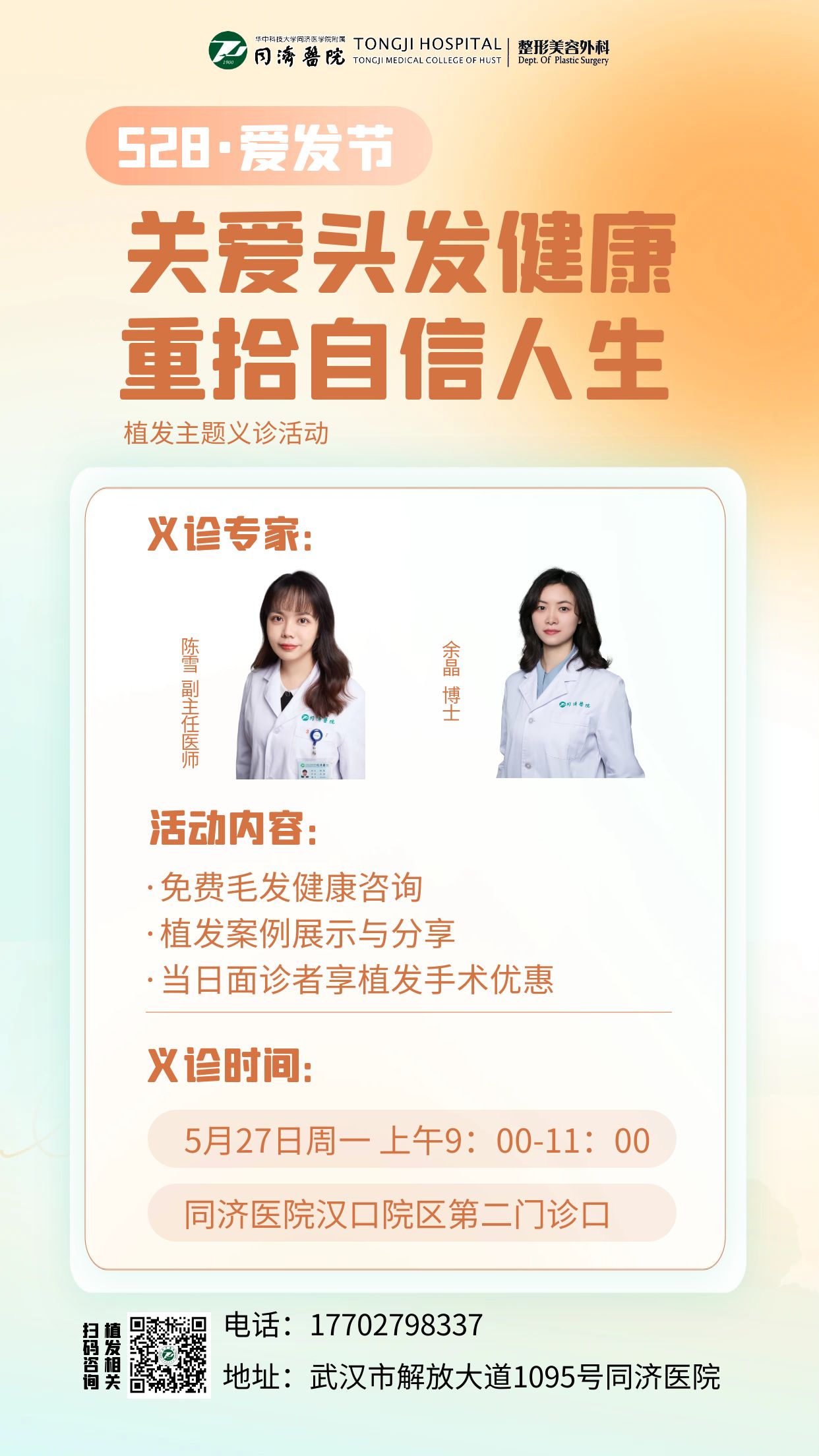 为深入贯彻《改善就医感受、提升患者体验主题活动方案(2023-2025年)》的精神,值此“5.28爱发日”来临之际,同济医院整形美容外科植发医联体发起“健康与美,从「头」开始”护发线下免费义诊活动,旨在科学传播正确的毛发健康知识,关注毛发患者身心健康,解决毛发疾病困扰。届时我院资深毛发团队将为你面对面答疑解惑,推荐治疗方案,指导治疗用药,介绍最新诊疗讯息。