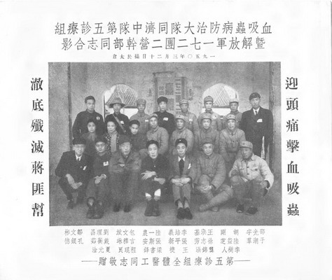 血吸虫防治大队同济中队第五诊疗组与解放军172团2营干部合影