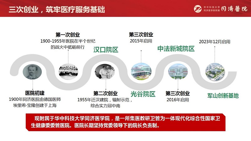 1900年同济医院由德国医师埃里希·宝隆创建于上海。1955年迁至武汉,经过120余年的建设与发展,如今已成为学科门类齐全、英才名医荟萃、师资力量雄厚、医疗技术精湛、诊疗设备先进、科研实力强大、管理方法科学的集医疗、教学、科创、公共卫生和医院管理研究为一体的现代化综合性国家卫生健康委委管医院,综合实力居国内医院前列。