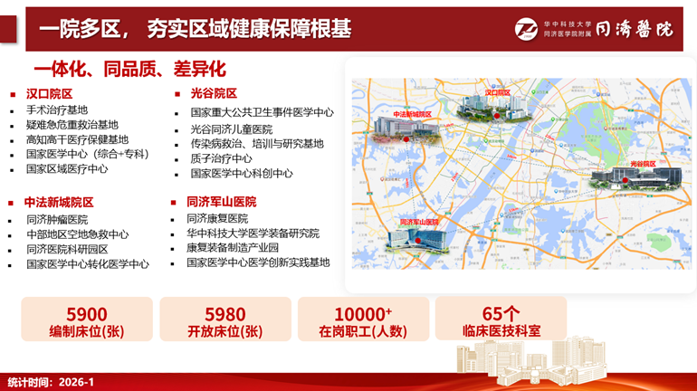 重视平台建设,专科实力雄厚。医院现有汉口院区、光谷院区、中法新城院区、同济军山医院,设65个临床和医技科室;是世界卫生组织康复培训中心、国家重大公共卫生事件医学中心、综合类国家医学中心创建单位、国家妇产疾病临床医学研究中心、国家区域医疗中心建设输出单位(3家)、委省共建国家高质量发展试点医院;拥有教育部国家重点学科11个(含培育学科3个)、国家临床重点专科及建设项目43个(全国第二);拥有全国重点实验室1个、教育部重点实验室3个、国家卫健委重点实验室2个。
