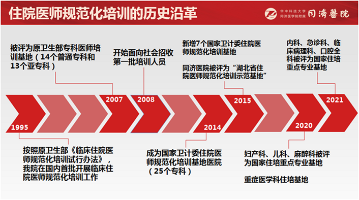 同济医院住院医师规范化培训工作开始于1995年,2014年成功获批第一批国家级住院医师规范化培训基地。2015年荣获“湖北省住院医师规范化培训示范基地”称号。同济医院始终坚持贯彻落实国家卫生政策方针,依据国家和湖北省的相关规定,制定符合国家要求,符合同济实际情况的住培制度,做到与时俱进,严谨求实,开拓创新,核对住培工作的每一个细节,一切以培养合格的住院医师为目标,不断探索和实践更加贴合实际的培训方法。