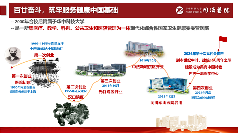 1900年同济医院由德国医师埃里希·宝隆创建于上海,1955年迁至武汉。经过120余年的建设与发展,如今已成为学科门类齐全、英才名医荟萃、师资力量雄厚、医疗技术精湛、诊疗设备先进、科研实力强大、管理方法科学的集医疗、教学、科创、公共卫生和医院管理研究为一体的现代化综合性国家卫生健康委委管医院,综合实力居国内医院前列。