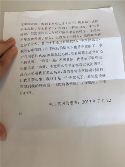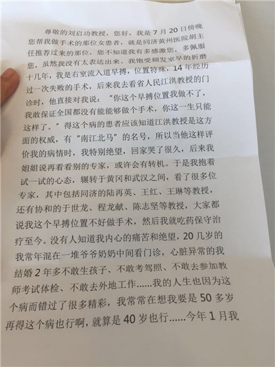 她没有放弃希望,她相信一定会有转机。2017年1月,她抱着试一试的心态找到了同济医院心内科刘启功教授,刘启功看到她如此年青,不做手术太可惜,给了女孩一个希望,这是一个病人与患者同时努力的方向。在考虑了半年后,7月,黄岗女孩成功手术,现在已经完全康复。