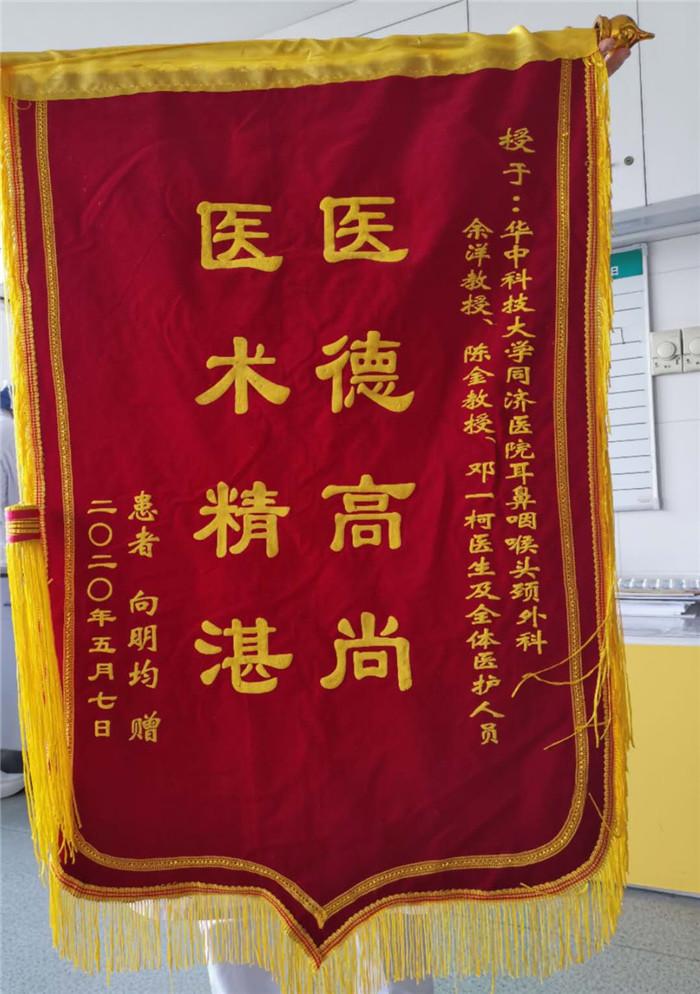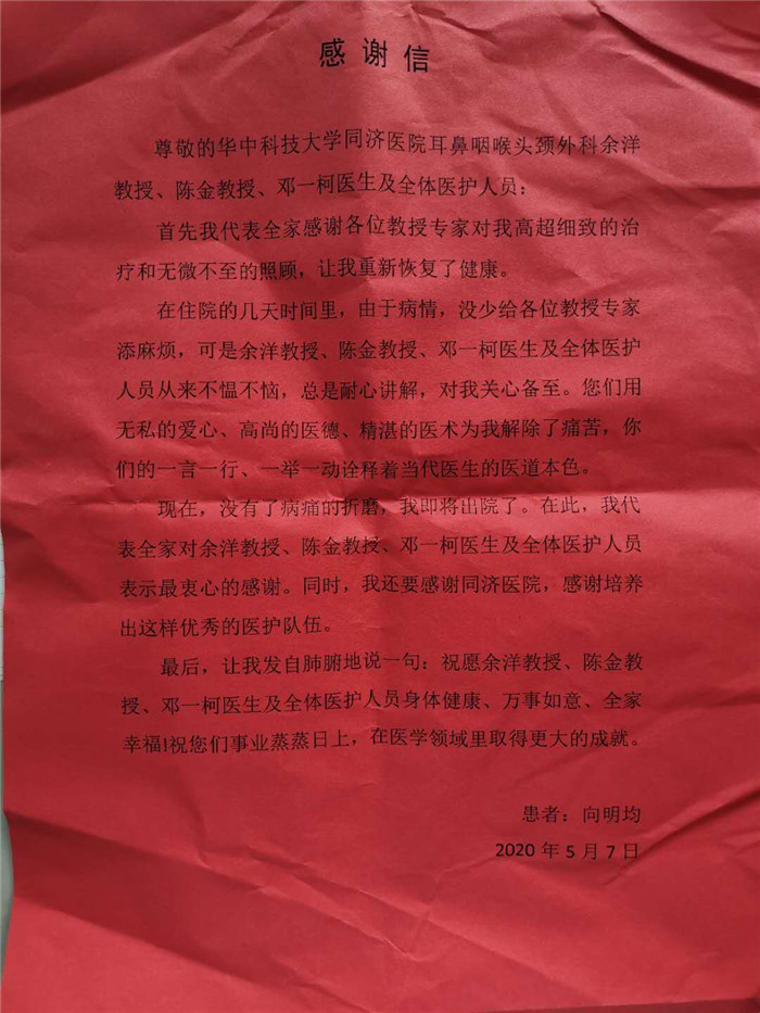 感谢信-致耳鼻咽喉头颈外科余洋、陈金、邓一柯及全体医护人员