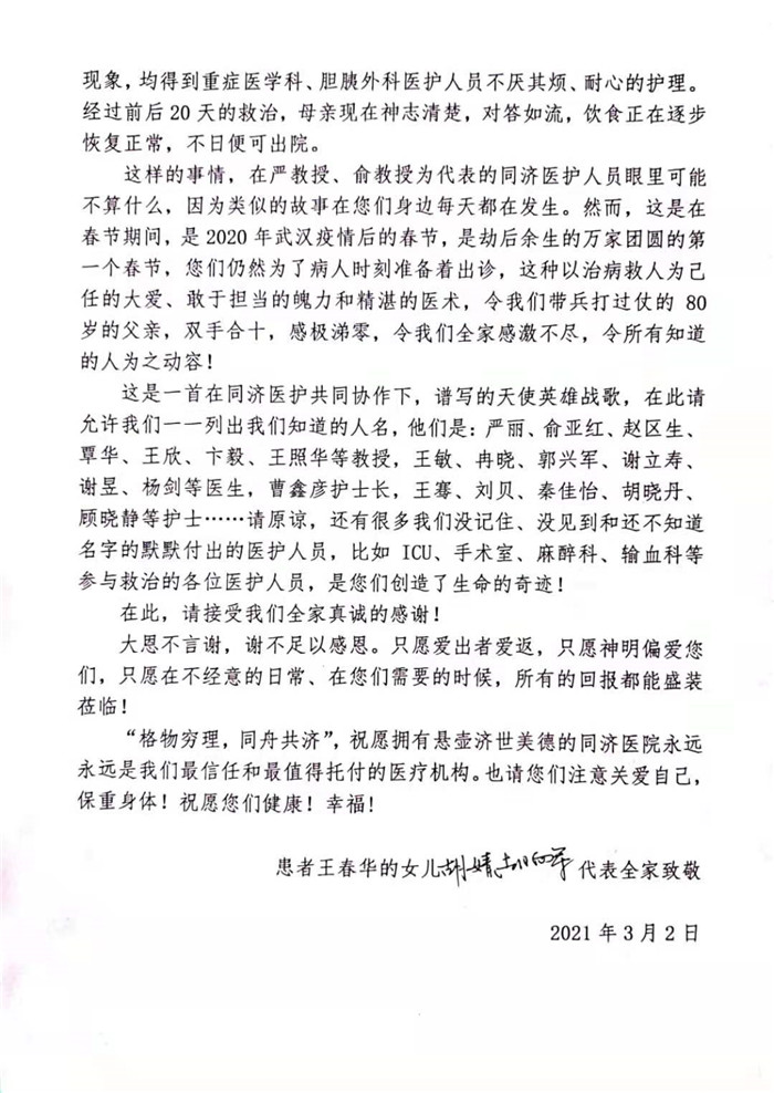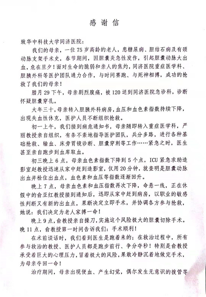 患者给重症医学科、胆胰外科的感谢信