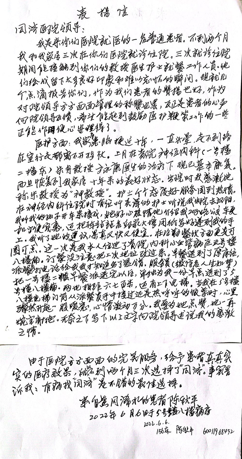 患者给神经内科朱舟副教授及护理团队的感谢信