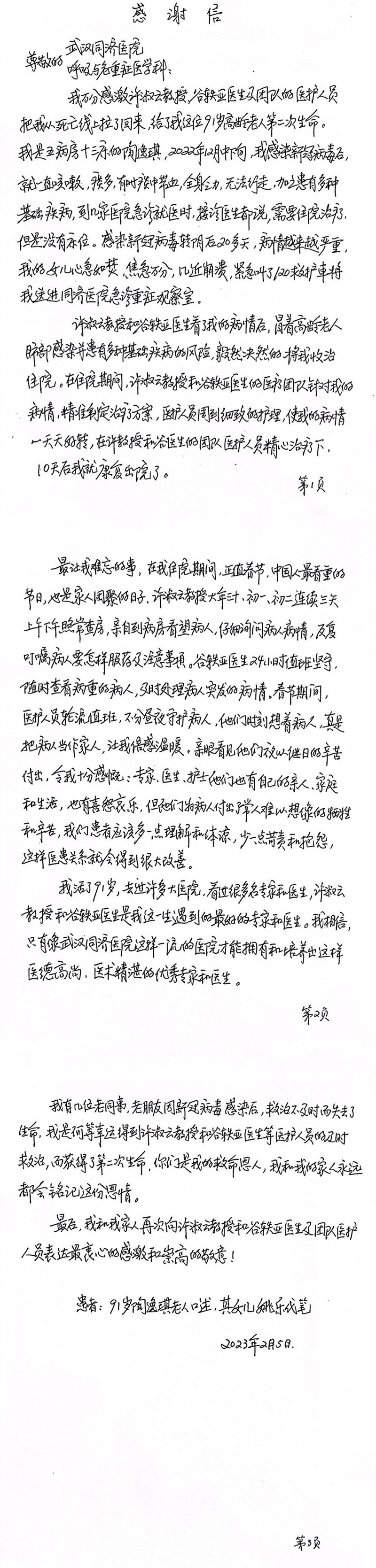 91岁高龄患者给呼吸内科许淑云教授、谷轶亚医生及团队医护人员的感谢信