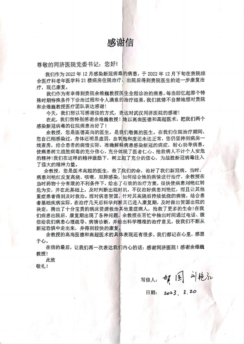 患者给老年医学科余维巍医生的感谢信