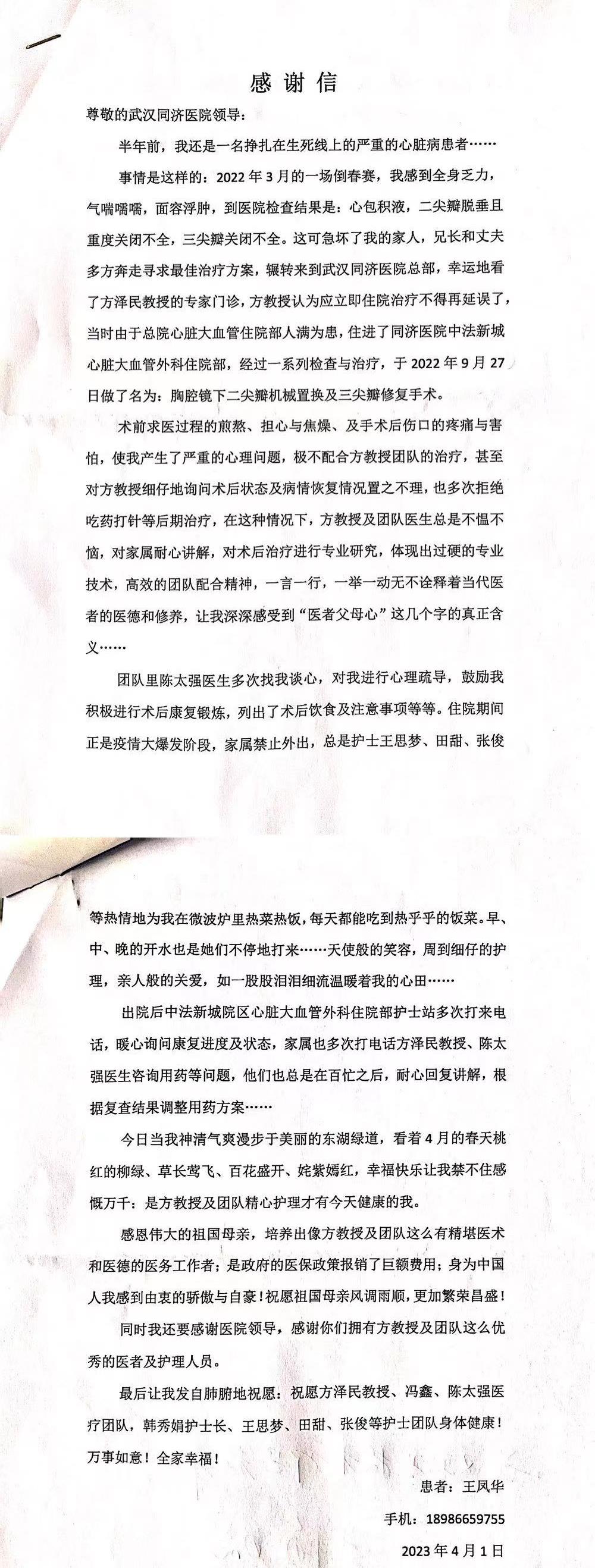 患者给心脏大血管外科方泽民团队的感谢信