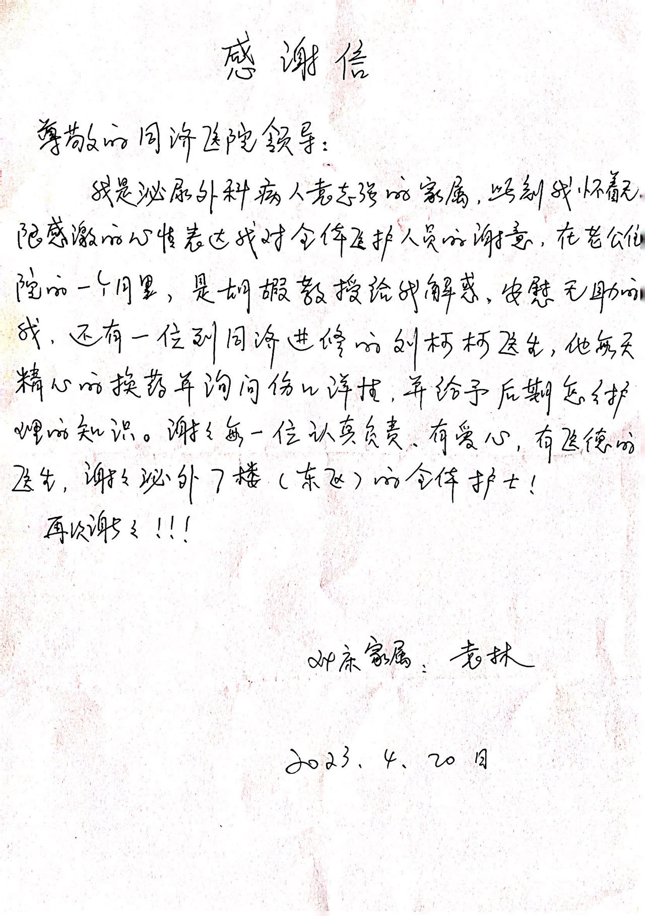 患者家属给泌尿外科的感谢信