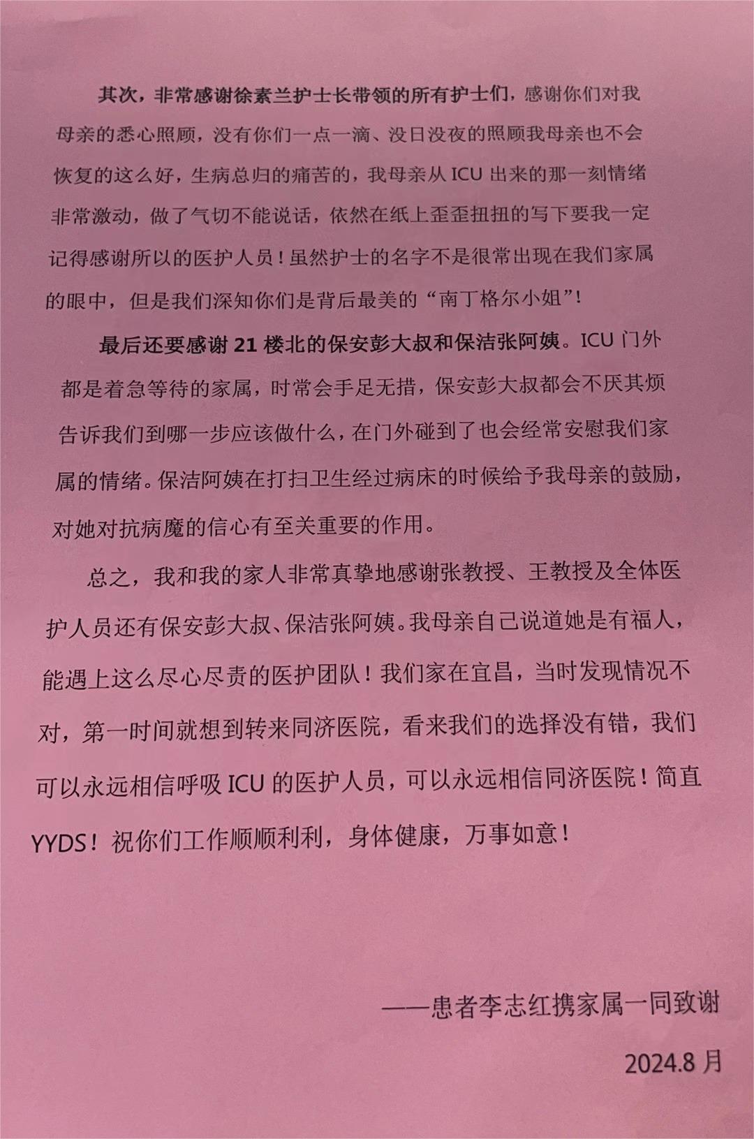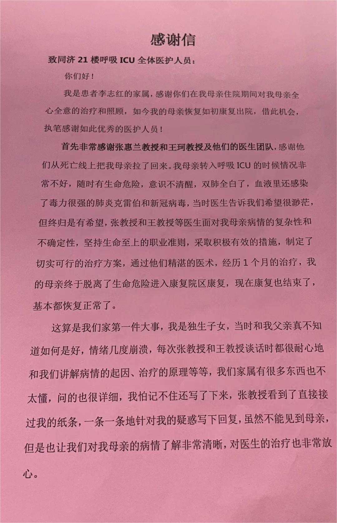 患者家属给呼吸内科张惠兰教授团队的感谢信