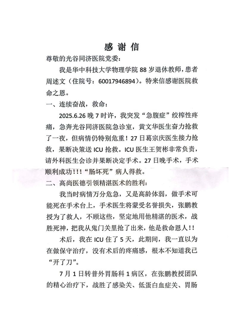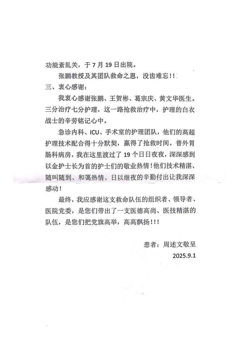 患者给急诊科、ICU及胃肠外科医护人员的感谢信
