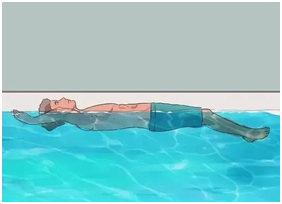 4.若因水温过低而疲劳产生小腿抽筋,则可使身体成仰卧姿势。用手握住抽筋腿的脚趾,用力向上拉,使抽筋腿伸直,并用另一腿踩水,另一手划水,帮助身体上浮,这样连续多次即可恢复正常。