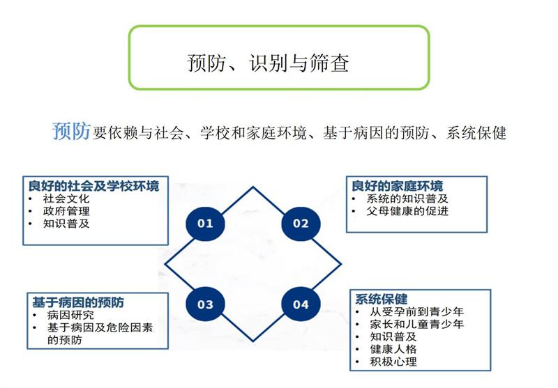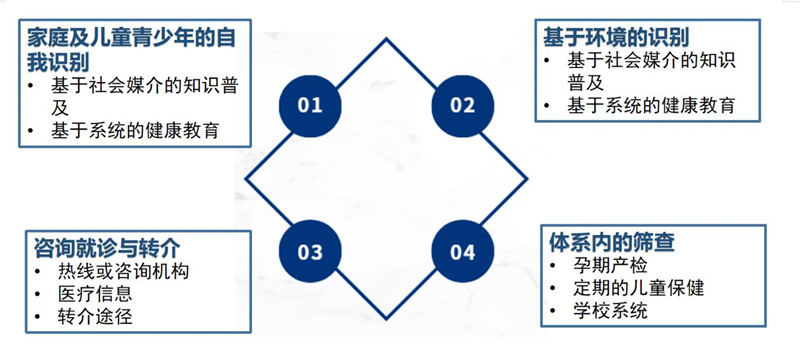 识别与筛查要依赖与家庭及儿童青少年自我、基于环境的识别、咨询就诊与转介、体系内筛查