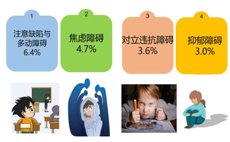 2021年我国首个儿童和青少年的精神障碍流调报告(纳入6-16岁17524名儿童)显示精神疾病患病率为17.5%,也就是近每6名儿童有1名精神疾病患儿。患病率最高的精神疾病如下图