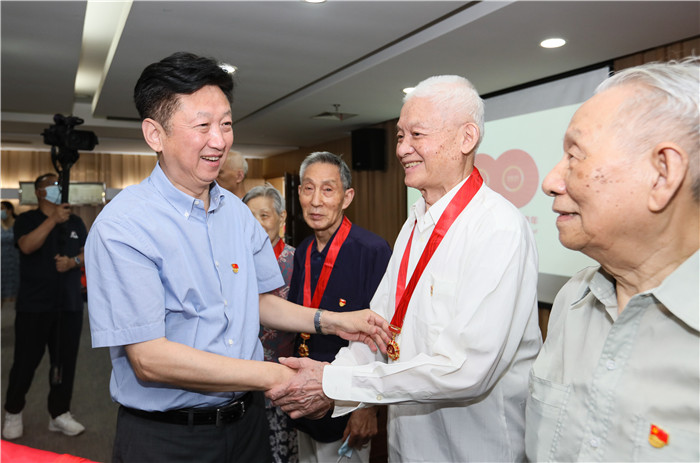 在中国共产党成立100周年到来之际,6月25日上午,华中科技大学同济医学院附属同济医院30余名老党员代表齐声合唱,祝福中国共产党百年华诞,郑重地将“光荣在党50年”纪念章戴在胸前。