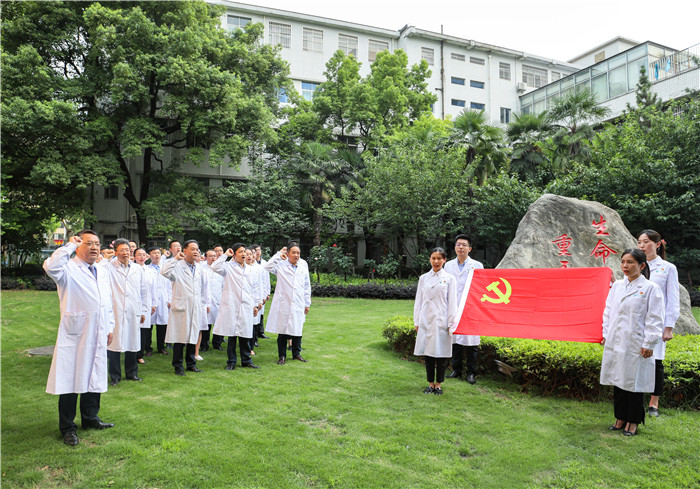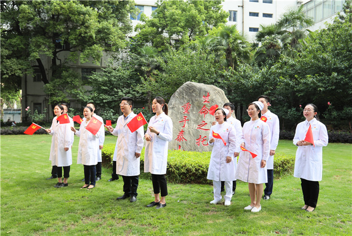 医院党员代表重温入党誓词,铮铮誓言表达着牢记初心使命、矢志砥砺前行的坚定决心。青年党员则通过歌声表达对党的深情,展现同济人昂扬的精神风貌。