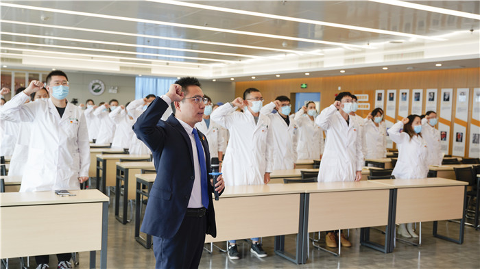 在这堂40分钟的思政课上,周宁把大家带回到那个众志成城的冬天,他们“尖刀连”逆行而上,不惜代价抢救新冠肺炎危重症患者,创造了一个又一个生命奇迹。台下许多学生们眼中含泪,为之感动,现场多次响起热烈的掌声。交流环节,从ECMO的使用到临床学生怎样调节心绪,从专业和团队素养养成到如何传承同济精神,面对学弟学妹提出的问题,周宁都悉心作答。最后,在他的带领下,学生们肃立,再次重温《医学生誓言》:“我志愿献身医学,热爱祖国,忠于人民,恪守医德……”
