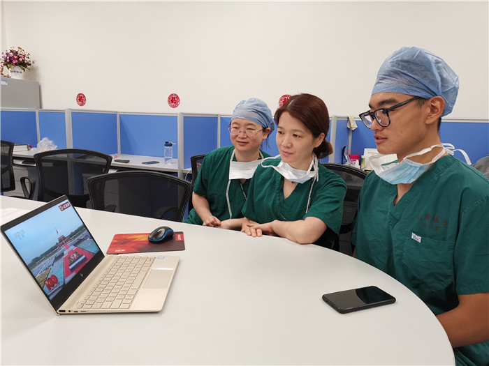 集中观看直播的党员师生们精神饱满、神情肃穆,共同见证了这一庄严而神圣的时刻。当战鹰飞过天安门,当100响礼炮鸣起,中华人民共和国国歌奏响,五星红旗冉冉升起之时,同志们全体起立,行注目礼,唱国歌,在全场富有青春力量的歌声中唱尽百年风华,饱含着对中国共产党百年华诞的深深祝福。在临床坚守的研究生党员通过电视、电脑、手机等多种形式观看大会,为党庆生。