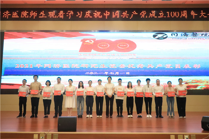 除了收看大会直播,同济医院研究生党委书记侯长荣带领现场全体党员同志重温入党誓词,并为获得2021年医院研究生党委“优秀党员”称号的15名学生颁奖。她说:“中国共产党100年的历史毕路蓝缕,成就辉煌,是由无数先贤先烈带领中国人民奋斗得来,习近平总书记说前辈们打下的江山,我们要守住,守住江山就是要守住人民的心。100年前的中国,是一批新青年为了民族的解放,寻找到了光明的道路,新时代青年,要牢记总书记的嘱托,要肩负起强国的使命,不负人民不负党。”