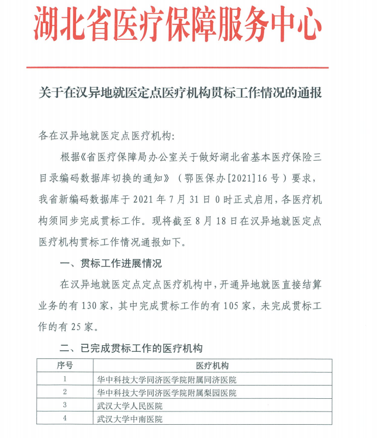 8月17日,湖北省医疗保障服务中心召开视频专题会议,通报医保“三目”(药品目录、材料目录和诊疗服务项目目录)贯标工作情况,我院贯标工作得到省医保中心重点表扬,完成数量质量位居全省第一。