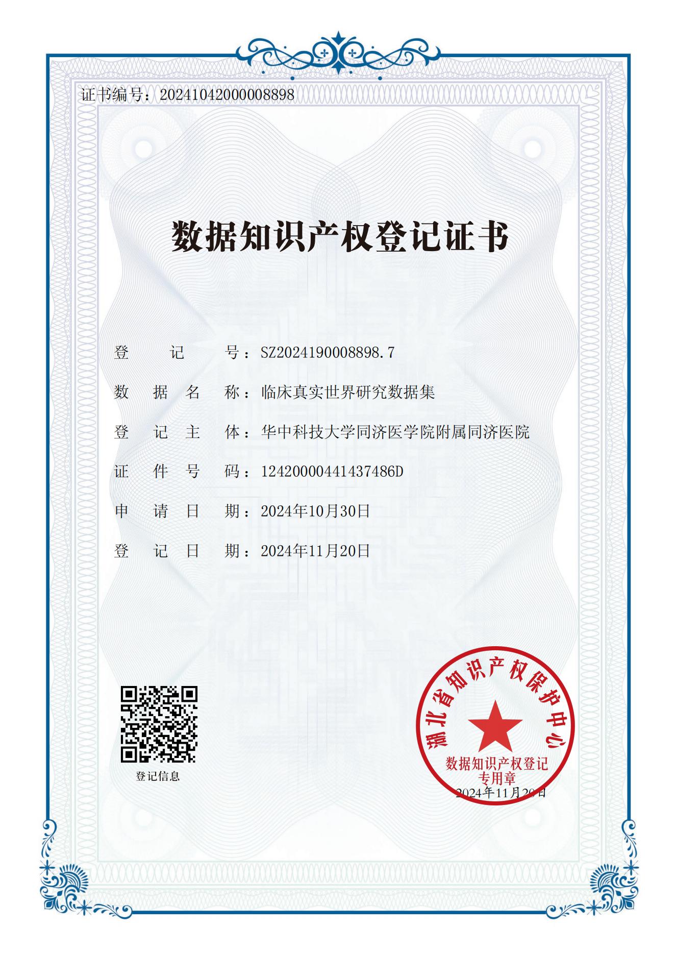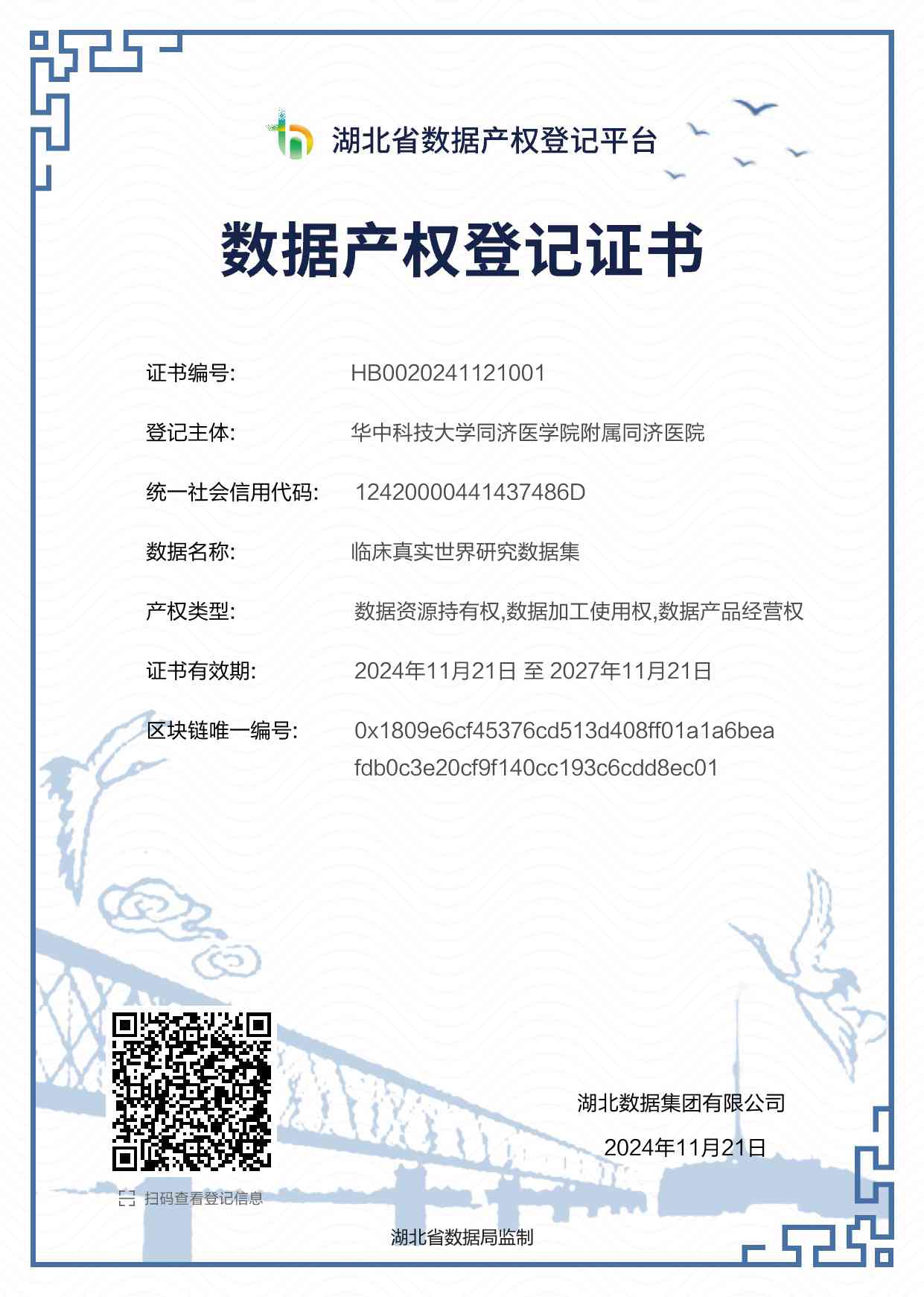 此次“双登记”数据集为“临床真实世界研究数据集”,该数据集是同济医院依托医院大数据平台,对临床健康医疗数据进行汇聚、治理与管理的基础上,经过严格的脱敏处理及安全加密,形成了标准化、高质量、匿名化的数据集,确保了数据的安全性和合法性,有利于推动数据资源的开放共享与安全利用。