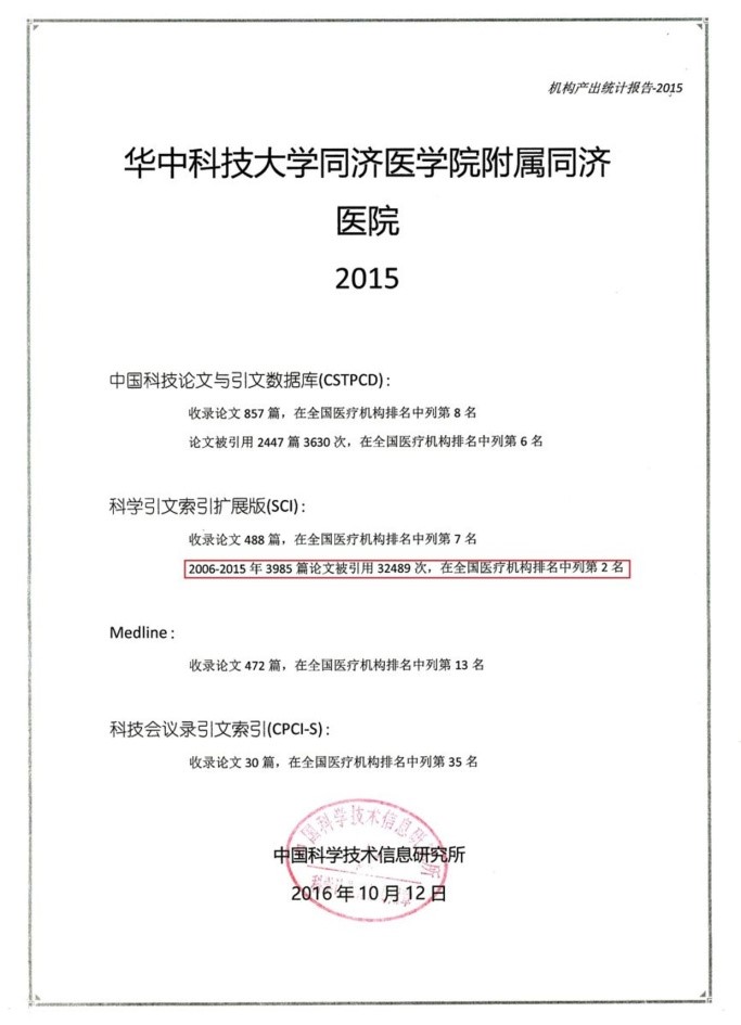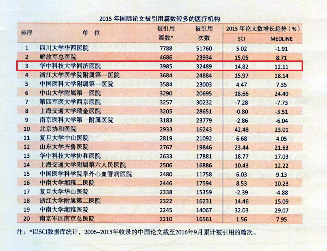 同济医院2015年度科技论文排名稳居全国医疗机构前列